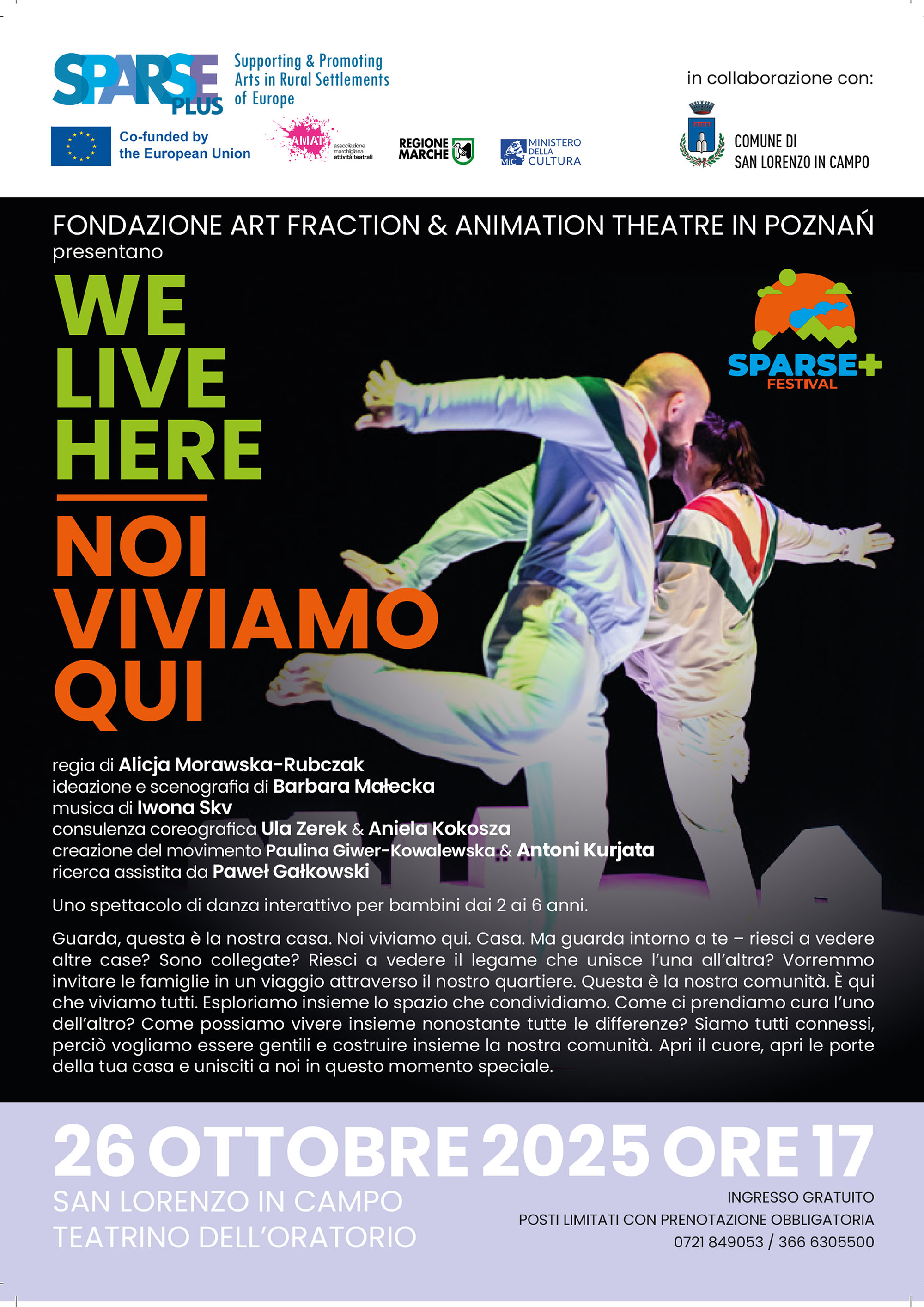 Il 26 ottobre 2025 al Teatrino dell’Oratorio di San Lorenzo in Campo la compagnia polacca Art Fraction presenta We live here. Lo spettacolo interattivo è dedicato alle bambine e ai bambini dai 2 ai 5 anni: danza, movimento e oggetti per invitare il giovanissimo pubblico a esplorare il tema della comunità e della convivenza. Un viaggio partecipato tra case, legami e gentilezza, per costruire insieme uno spazio condiviso fatto di empatia e creatività.