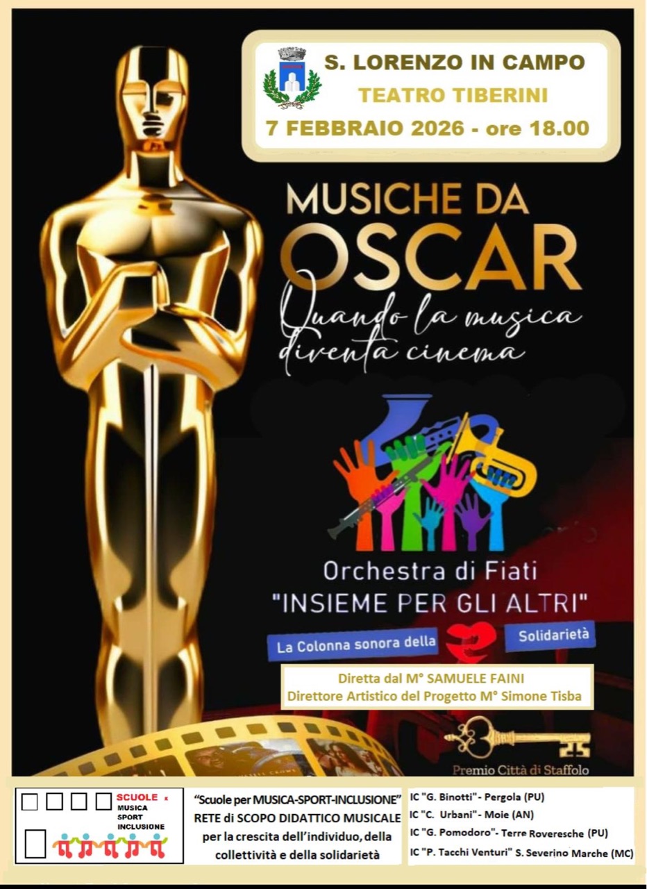 Sabato 7 febbraio 2026, alle ore 18:00, il Teatro Comunale 'Mario Tiberini' di San Lorenzo in Campo ospiterà lo spettacolo “Musiche da Oscar – Quando la musica diventa cinema”, un evento musicale di forte impatto artistico ed educativo che unisce giovani, scuola e territorio nel segno della solidarietà, all'interno della stagione teatrale di prosa 2026 '1 palco 1000 emozioni'.