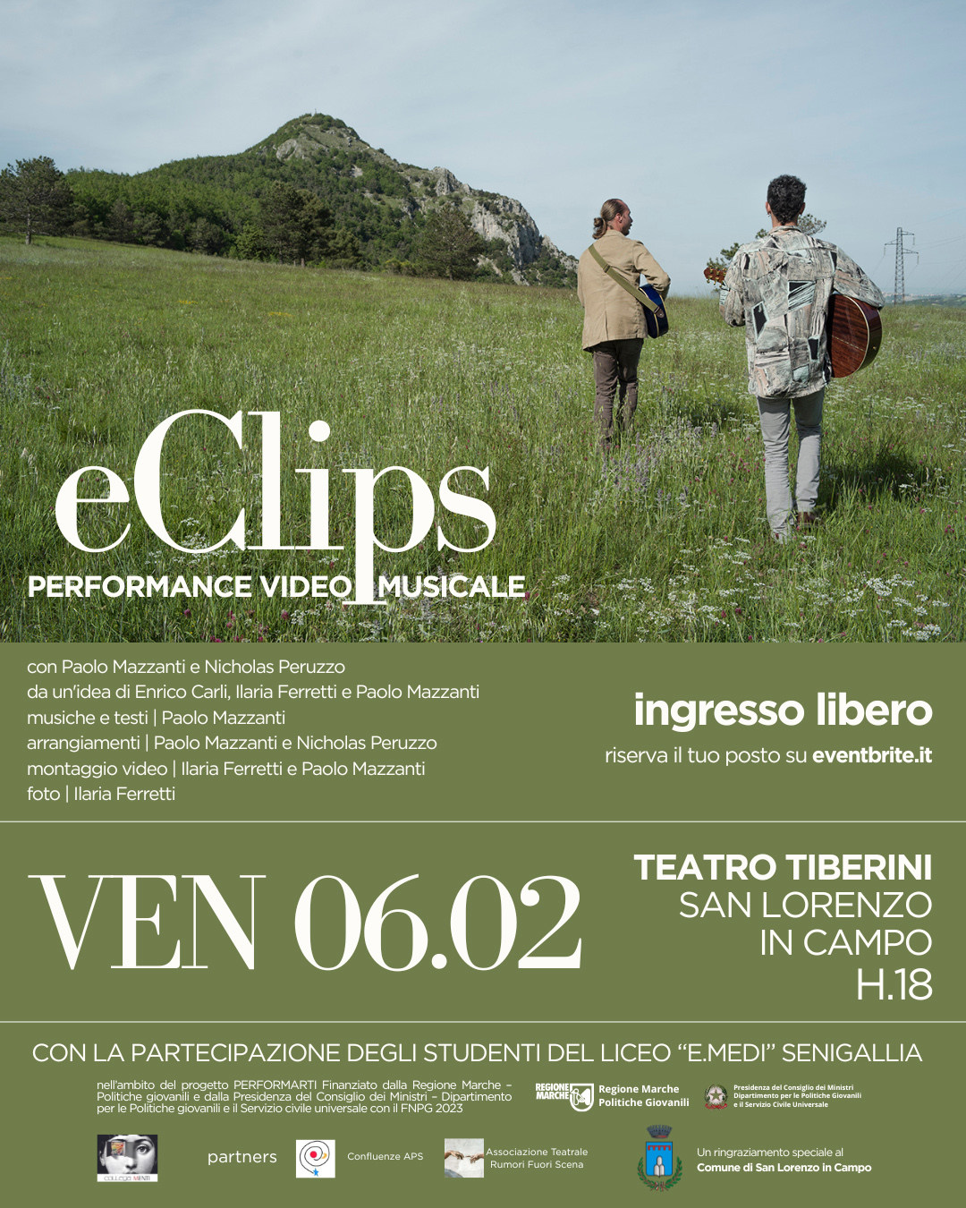 eClips è una performance video musicale che rientra nel progetto PerformArti, laboratorio di idee, arti e visioni dedicato ai giovani dai 14 ai 35 anni delle Marche. Lo spettacolo nasce da un’idea di Paolo Mazzanti ed Enrico Carli, con musiche e testi di Paolo Mazzanti e arrangiamenti di Paolo Mazzanti e Nicholas Peruzzo. Il montaggio video è curato da Paolo Mazzanti e Ilaria Ferretti, che firma anche le fotografie.