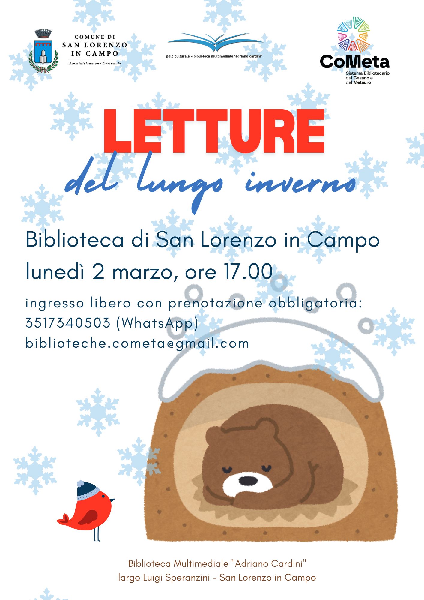 Lunedì 2 marzo 2026, alle ore 17:00, presso il Polo Culturale - Biblioteca Comunale Multimediale "Adriano Cardini", in Largo Luigi Speranzini, Cometa Biblioteche in collaborazione con l'Amministrazione Comunale - Assessorato alla Cultura ed Assessorato ai Servizi Educativi, organizza una lettura per bambini.