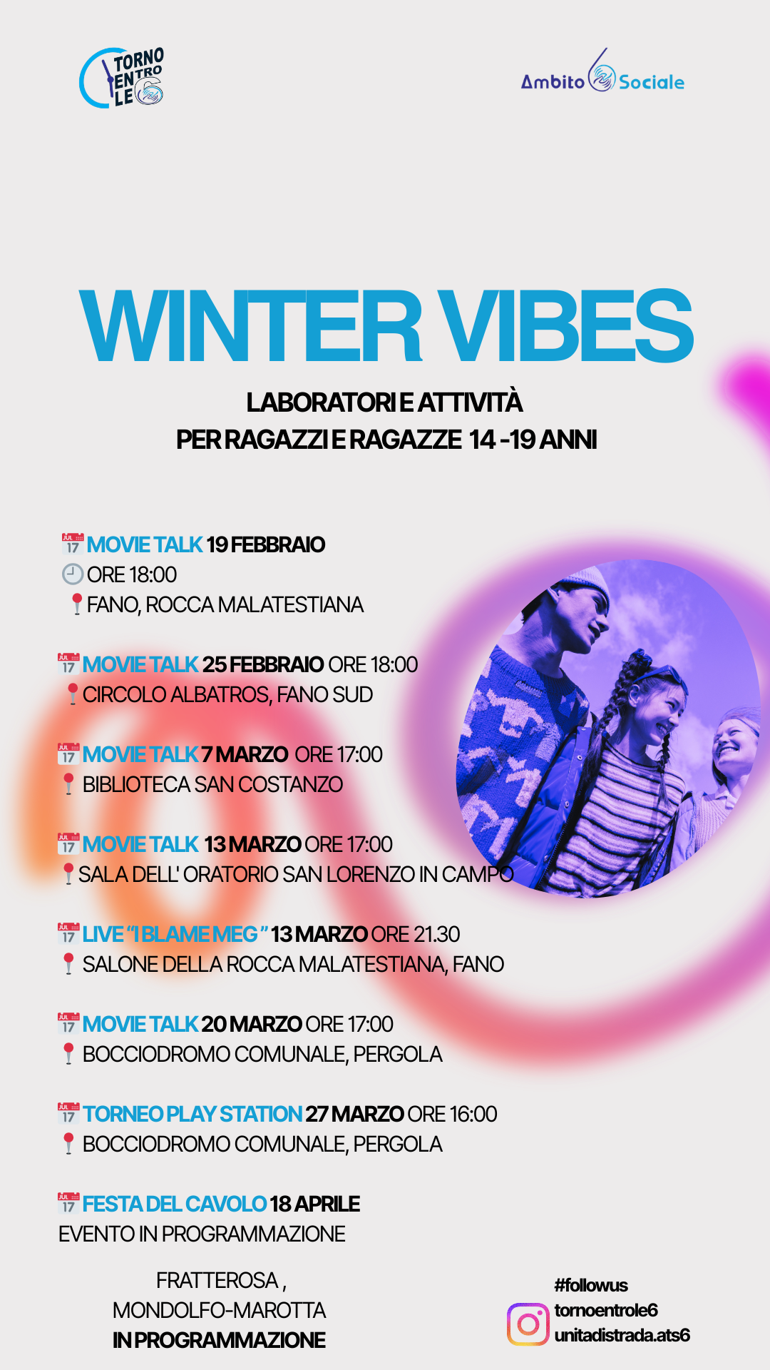 Winter Vibes, eventi gratuiti per la socializzazione dei ragazzi dai 14 ai 19 anni, grazie all'Unità di Strada dell'Ambito Sociale Territoriale n.6 di Fano, con il Patrocinio dell'Amministrazione Comunale e la collaborazione dell'Oratorio L'Aquilone.