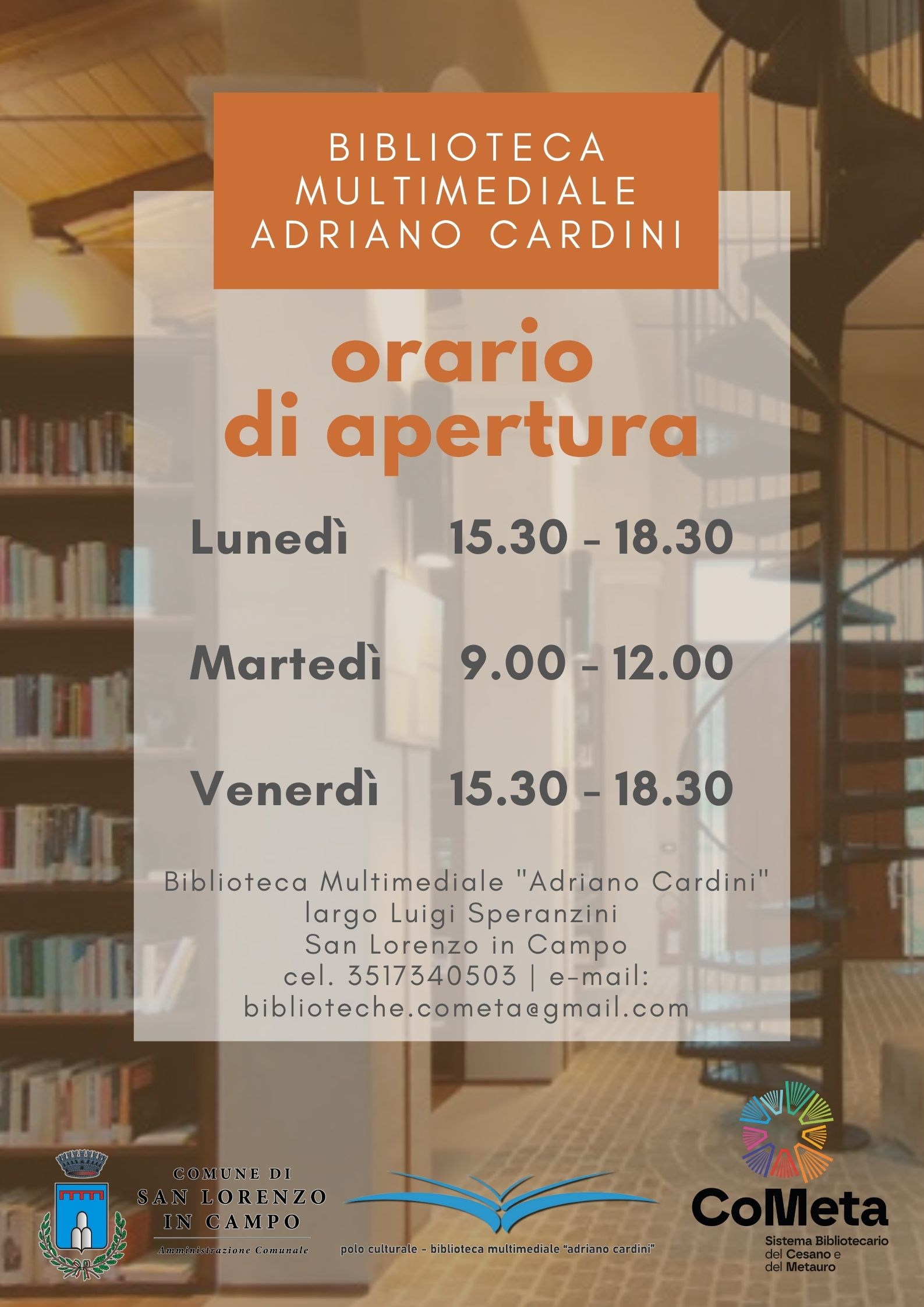 Dopo la pausa estiva, riapre la Biblioteca Comunale Multimediale "Adriano Cardini" di San Lorenzo in Campo, sita in Largo Luigi Speranzini, con i seguenti orari: lunedì 15:30-18:30, martedì 09:00-12:00, venerdì 15:30-18:30.