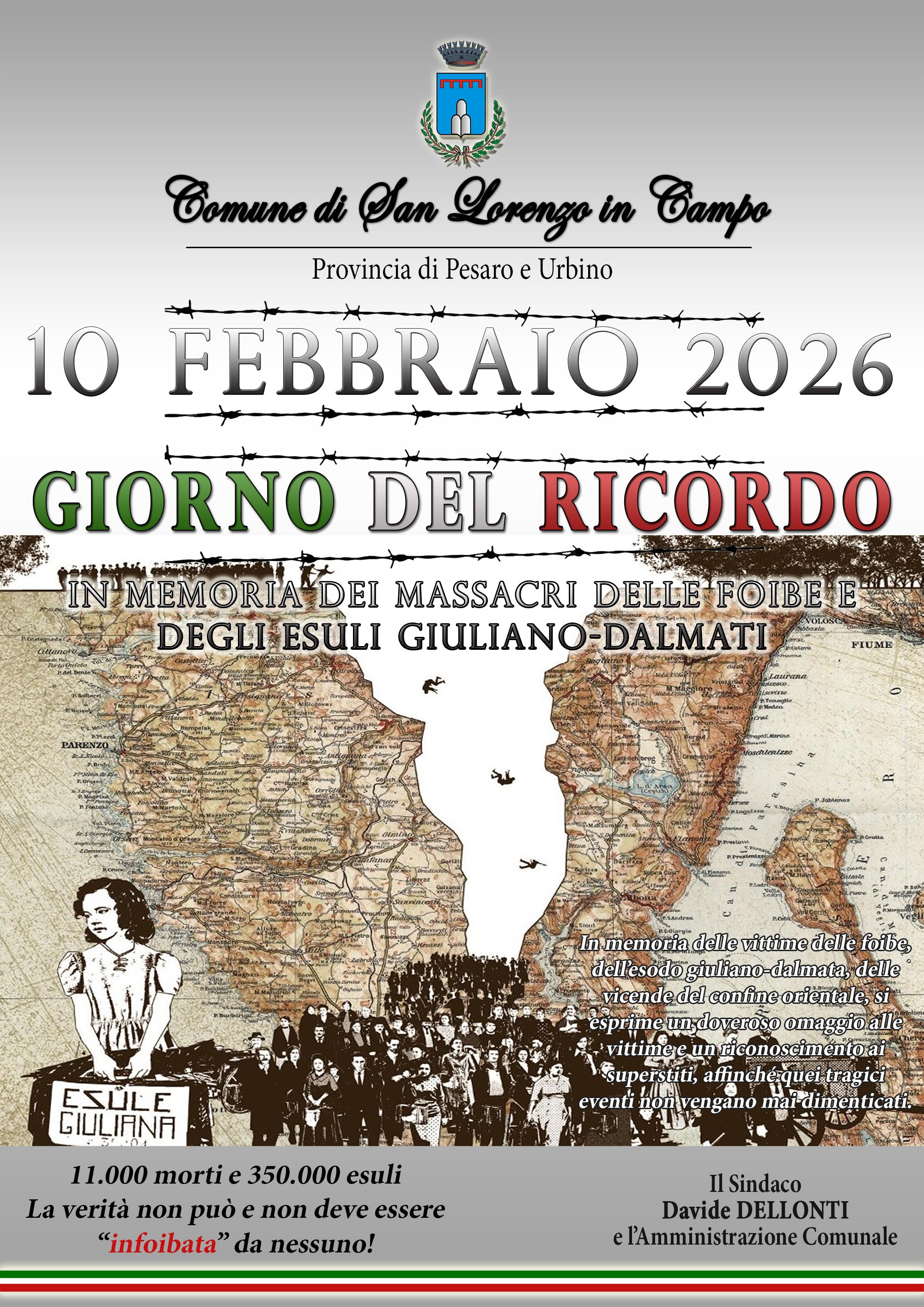 In occasione del 10 Febbraio, Giorno del Ricordo, l’Amministrazione Comunale di San Lorenzo in Campo intende onorare la memoria delle vittime dei massacri delle foibe e ricordare il drammatico esodo degli italiani di Istria, Fiume e Dalmazia.